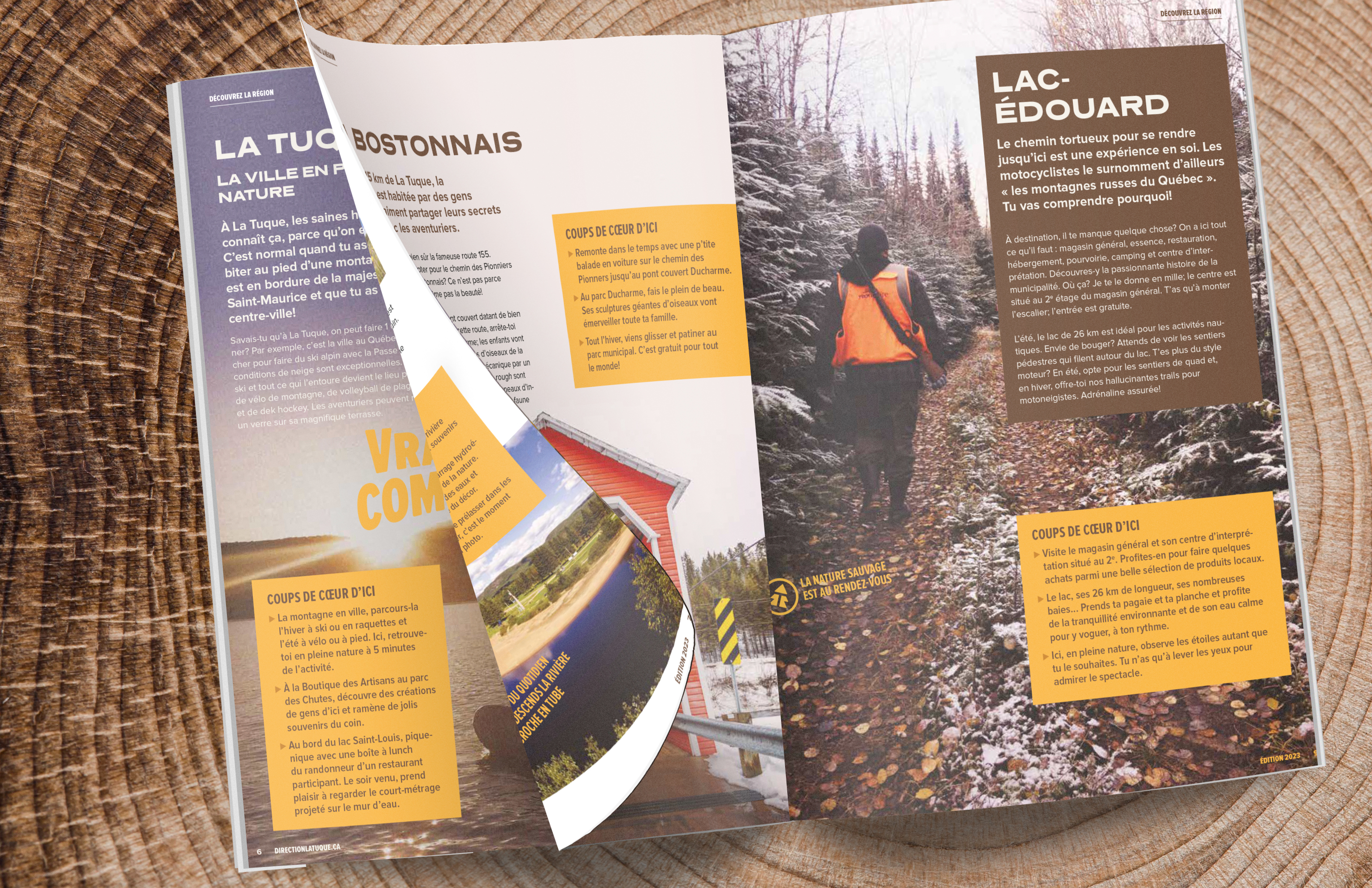 L'équipe municipale de Tourisme La Tuque est fière de présenter la nouvelle édition 2023 de son magazine touristique disponible gratuitement dès maintenant au bureau d'accueil du parc des Chutes-de-la-Petite-Rivière-Bostonnais et qui sera disponible prochainement dans différentes entreprises de La Tuque, de la Mauricie et des régions limitrophes (Lac-Saint-Jean, Portneuf, etc.). En plus de faire découvrir les attraits de l'agglomération de La Tuque dans le but d'attirer des visiteurs, la nouvelle édition du magazine touristique fait la promotion de la nouvelle image de marque.