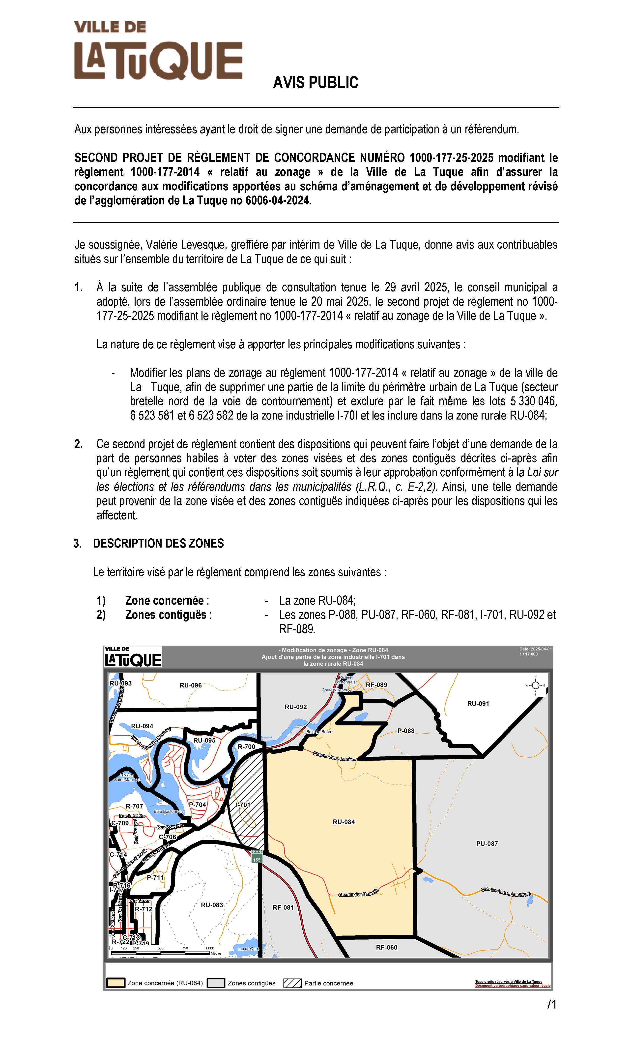 Avis public - Second projet de règlement de concordance 1000-177-25-2025 modifiant le règlement 1000-177-2014 relatif au zonage de la Ville de La Tuque