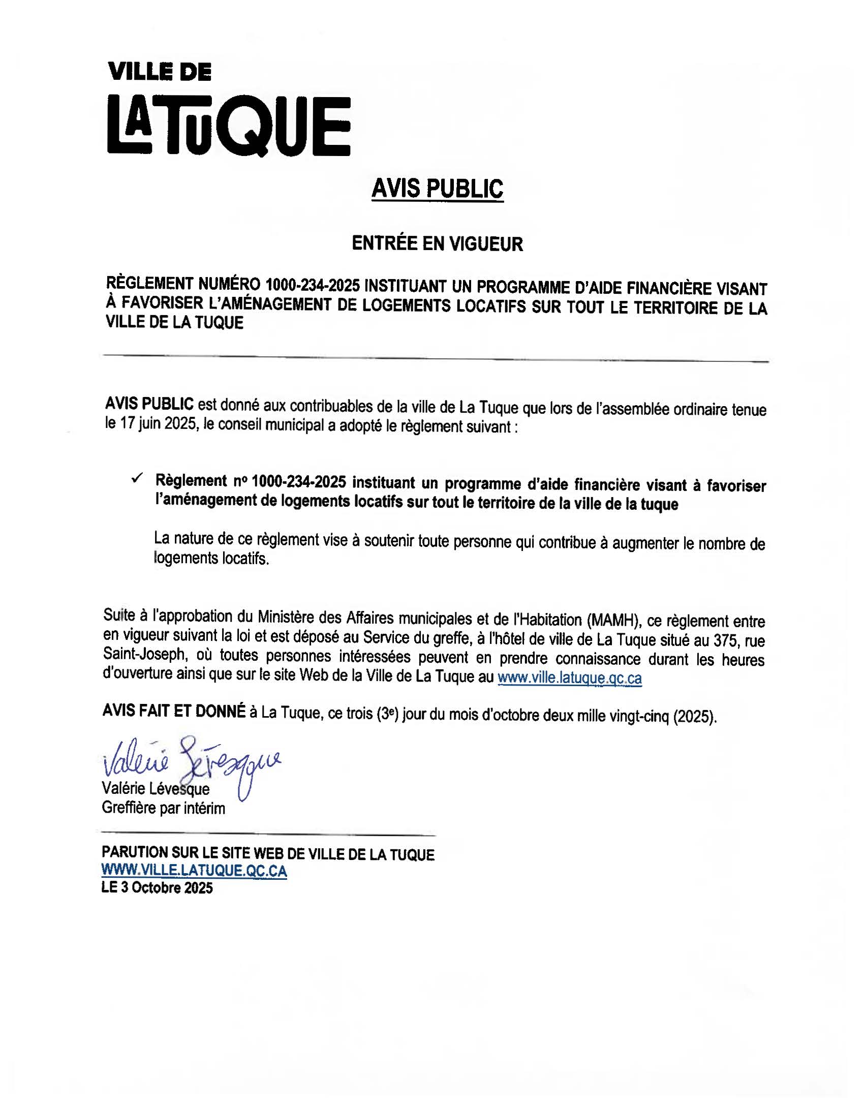 Avis public d'entrée en vigueur règlement 1000-234-2025 instituant un programme d'aide financière visant à favoriser l'aménagement de logements locatifs sur tout le territoire de la Ville de La Tuque