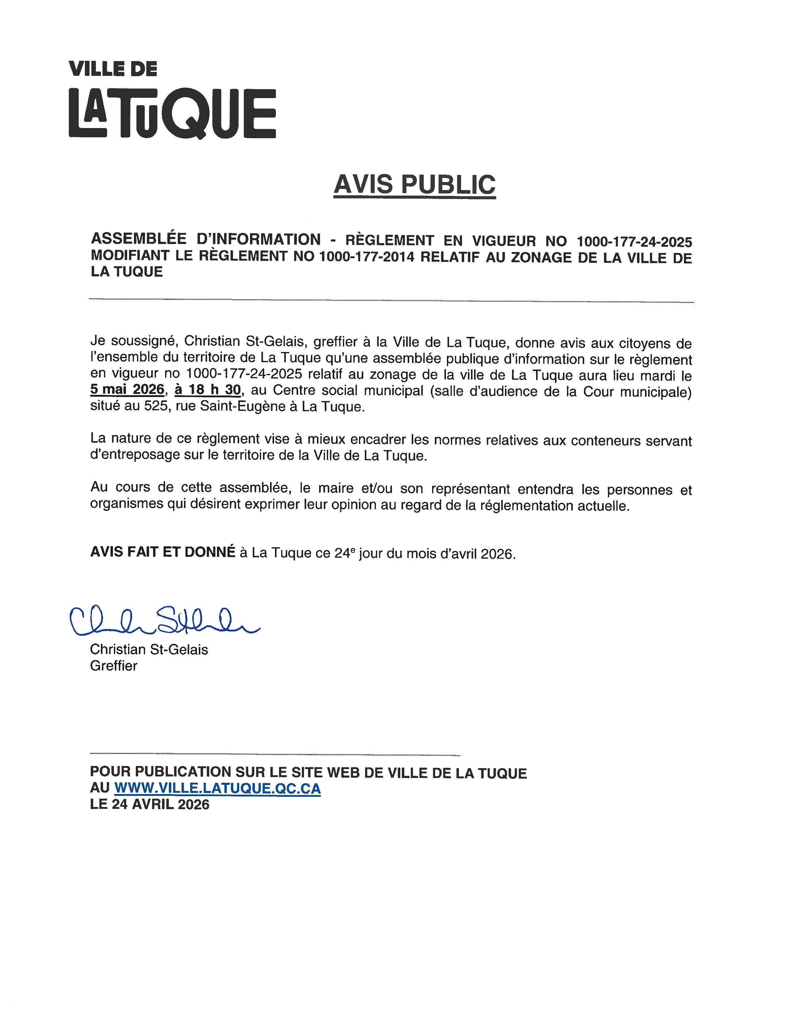 Assemblée d'information - Règlement en vigueur no 1000-177-24-2025 modifiant le règlement no 1000-177-2014 relatif au zonage (conteneurs)