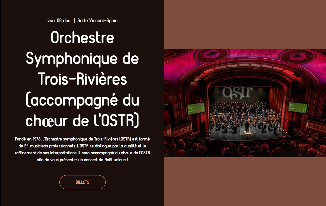 Fondé en 1978, l'Orchestre symphonique de Trois-Rivières (OSTR) est formé de 54 musiciens professionnels. L'OSTR se distingue par la qualité et le raffinement de ses interprétations saluées par de nombreuses récompenses, dont des prix Opus, Félix et Juno, ainsi que par deux disques d'or. Sa programmation fait une place importante aux chefs-d'?uvre du grand répertoire et aux solistes de renom.