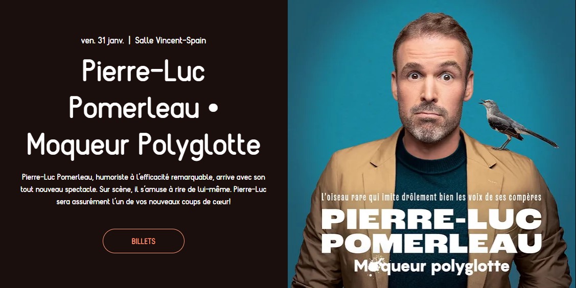 Pierre-Luc Pomerleau, humoriste à l'efficacité remarquable, arrive avec son tout nouveau spectacle : Moqueur polyglotte. Sur scène, il s'amuse à rire de lui-même, notamment de son côté lunatique et maladroit, en mettant de l'avant ses histoires personnelles avec une gestuelle démonstrative et une rythmique étonnante. L'humoriste derrière les hilarantes et populaires capsules « Les p'tites trouvailles de PLP » sur le thème de Marketplace (à voir absolument!) aborde des sujets rassembleurs dans lesquels le public se reconnaîtra sans aucun doute. Pierre-Luc sera assurément l'un de vos nouveaux coups de c?ur!