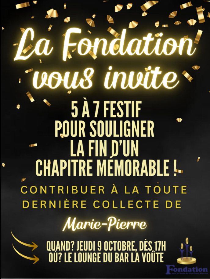 Le conseil d'administration de la Fondation pour la Santé du Haut‑Saint‑Maurice a le plaisir de vous convier à un 5 à 7 festif, en l'honneur du départ de Madame Marie‑Pierre Pilon, Directrice générale de la Fondation.