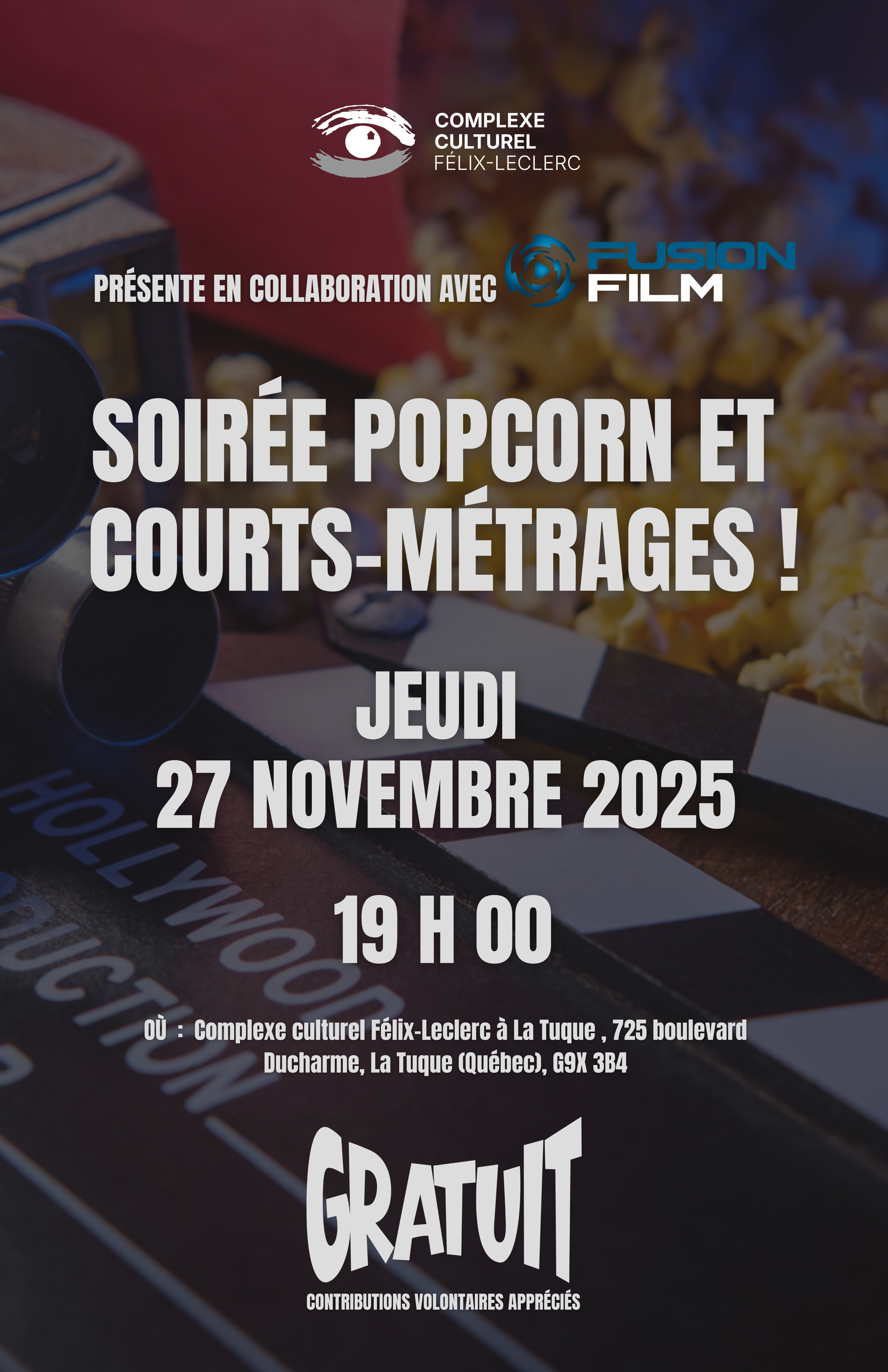 Afin de faire découvrir le septième art, le Complexe culturel Félix-Leclerc présentera, en collaboration avec Fusion Films, la toute première Soirée popcorn et courts-métrages, le jeudi 27 novembre, à 19 h, dans l'Espace Carole-Guérin du Complexe culturel Félix-Leclerc, à La Tuque.