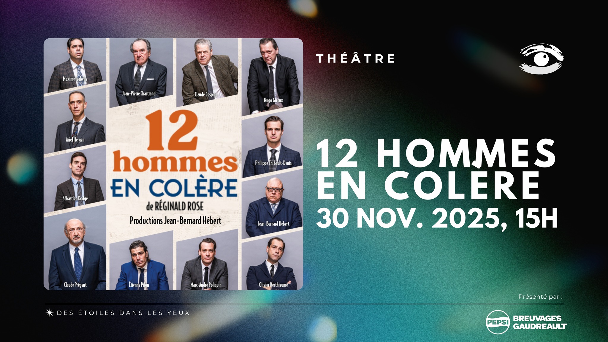 Un jury de 12 hommes doit décider du sort d'un jeune homme accusé d'homicide. Les preuves et les faits réunis contre lui sont accablants, et le verdict semble évident. Pourtant, un membre du jury n'est pas convaincu et a le courage de prendre position, allant au-delà des apparences et des préjugés. La pièce 12 HOMMES EN COLÈRE est remplie d'humanité, profondément actuelle, où les travers de la bêtise humaine sont omniprésents. Un suspense enlevant qui vous tiendra en haleine du début à la fin.