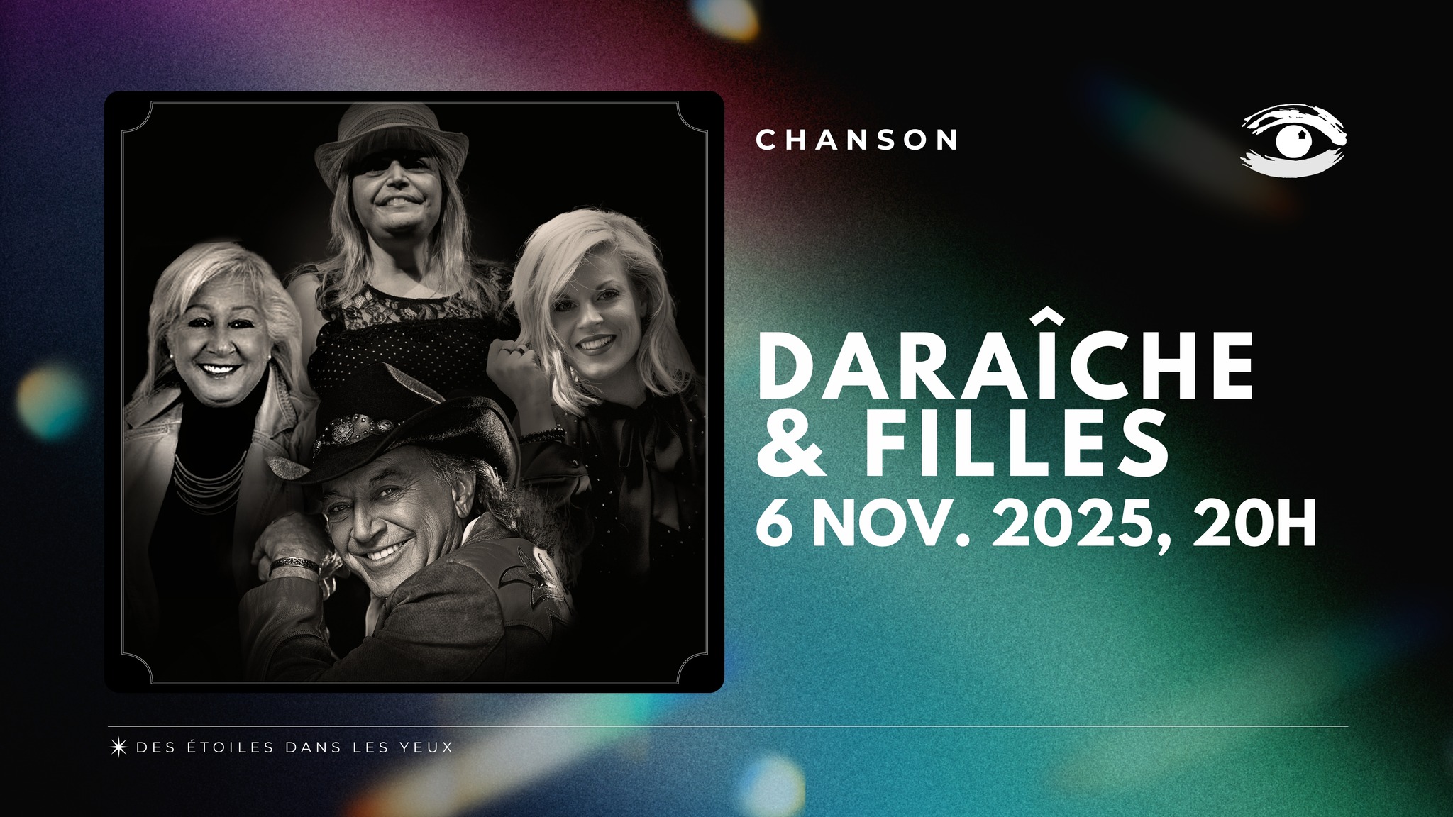 Ensemble, ils représentent ce que le Québec offre de plus authentique à l'héritage country d'ici et d'ailleurs. Le répertoire de la famille Daraîche sur scène s'inspire des grands classiques de la musique country, comme on les a connus et comme on veut les réentendre. Comptez sur Daraîche & Filles pour poursuivre la tradition.