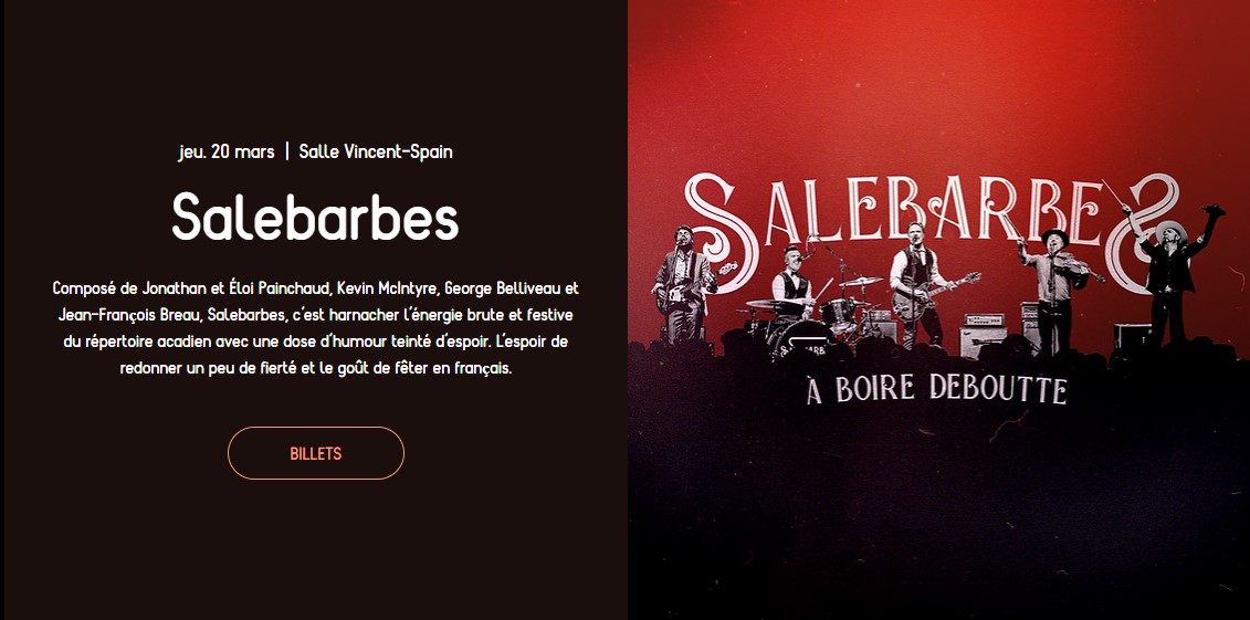 Composé de Jonathan et Éloi Painchaud, Kevin McIntyre, George Belliveau et Jean-François Breau, Salebarbes est un véhicule rêvé pour attacher les amarres du passé à la voiture du présent. Disponible depuis le 26 avril 2019 sur l'étiquette L-A be, l'album Live au Pas Perdus est un véritable voyage musical de l'Acadie à la Louisiane pendant lequel chanson francophone, groove et joie sont à l'honneur. Salebarbes, c'est harnacher l'énergie brute et festive du répertoire acadien avec une dose d'humour teinté d'espoir. L'espoir de redonner un peu de fierté et le goût de fêter en français. Une forme de réappropriation culturelle, une déportation à l'envers. Il y a comme une urgence de chanter, à l'unisson de préférence, ce maintenant qui s'effrite. Notre culture qui se souvient, à peine. Le voyage de notre langue, vaisseau qui tangue comme une bouteille à la mer, porteur d'un unique message : on n'est pas mort !