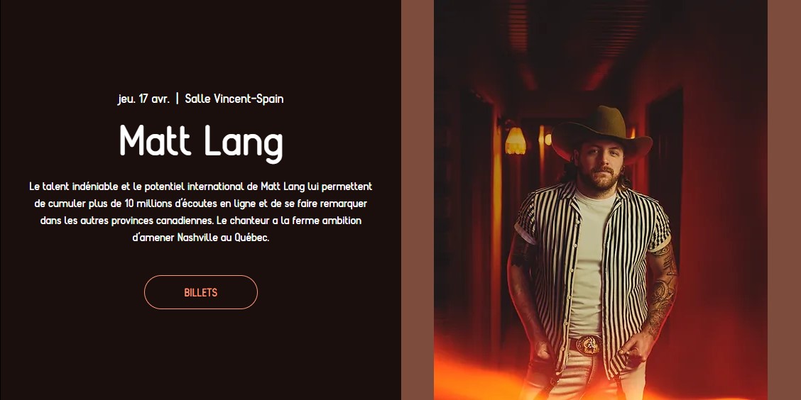 Figurant parmi les artistes new country canadiens les plus prometteurs, Matt Lang connaît un début de carrière fulgurant. Originaire de Maniwaki, c'est à Nashville qu'il enregistre son premier album éponyme anglophone qui voit le jour en 2018. Réalisé par Danick Dupelle, producteur québécois résidant dans le berceau du country depuis près de 18 ans et membre du groupe Emerson Drive, cet opus se hisse rapidement au sommet des ventes anglophones au Canada, aux côtés de? Paul McCartney et Eminem, en plus de se retrouver n° 1 des ventes country sur iTunes au Canada. Le talent indéniable et le potentiel international de Matt Lang lui permettent de cumuler plus de 10 millions d'écoutes en ligne de ce premier album et de se faire remarquer dans les autres provinces canadiennes. Si le chanteur a la ferme ambition d'amener Nashville au Québec, il caresse aussi le rêve d'une carrière internationale.