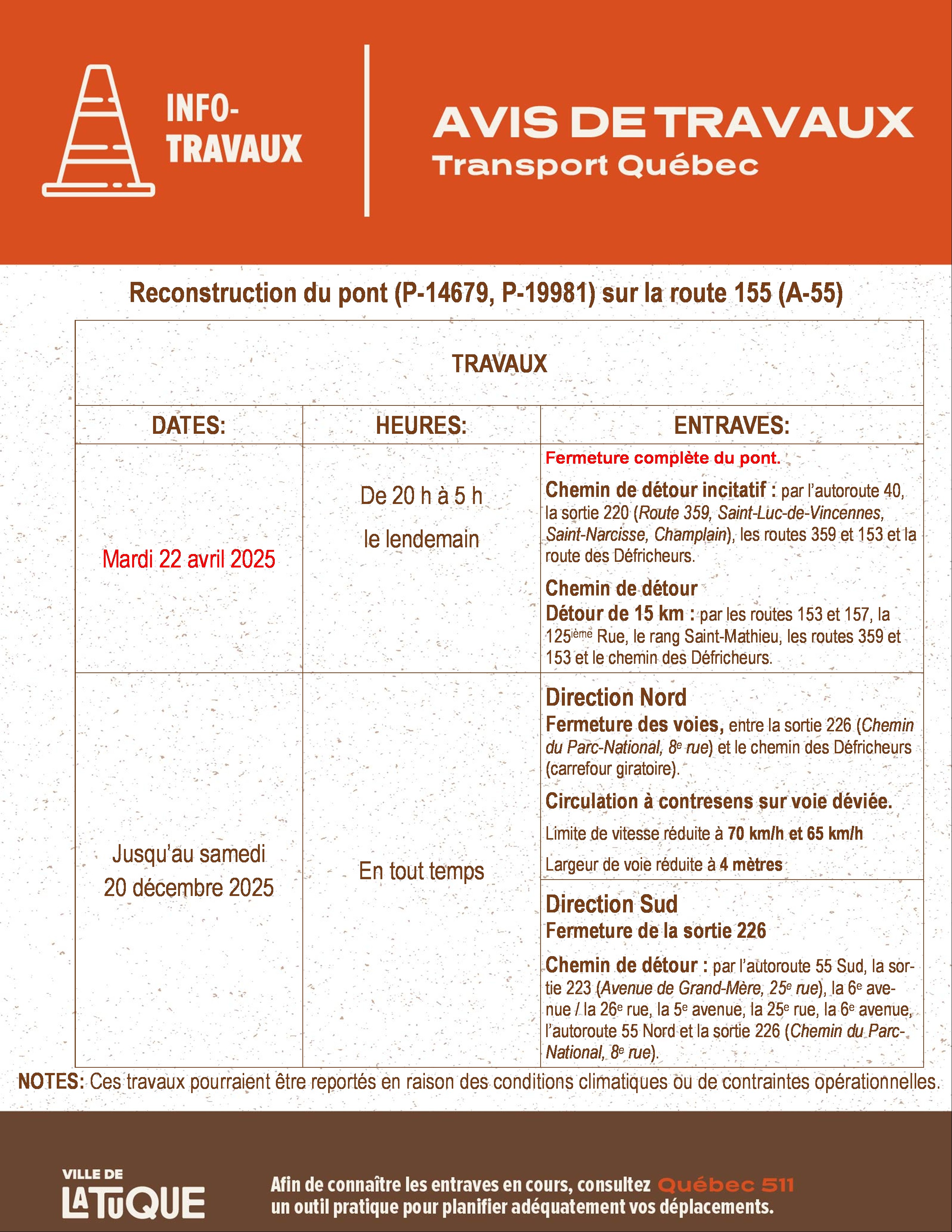 MISE À JOUR - Reconstruction du pont (P-14679, P-19981) sur la route 155 (A-55)