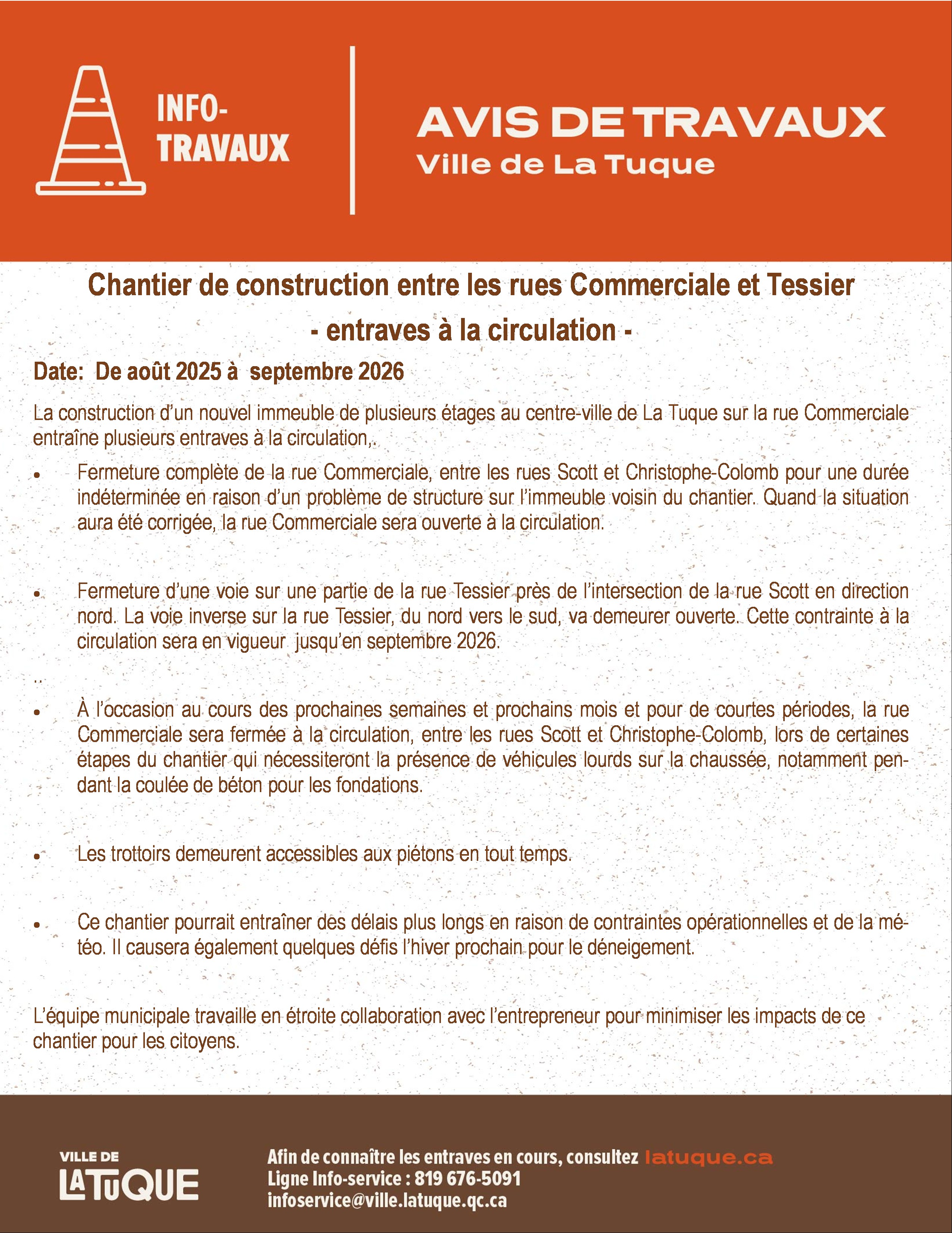 Chantier de construction entre les rues Commerciale et Tessier - entraves à la circulation -