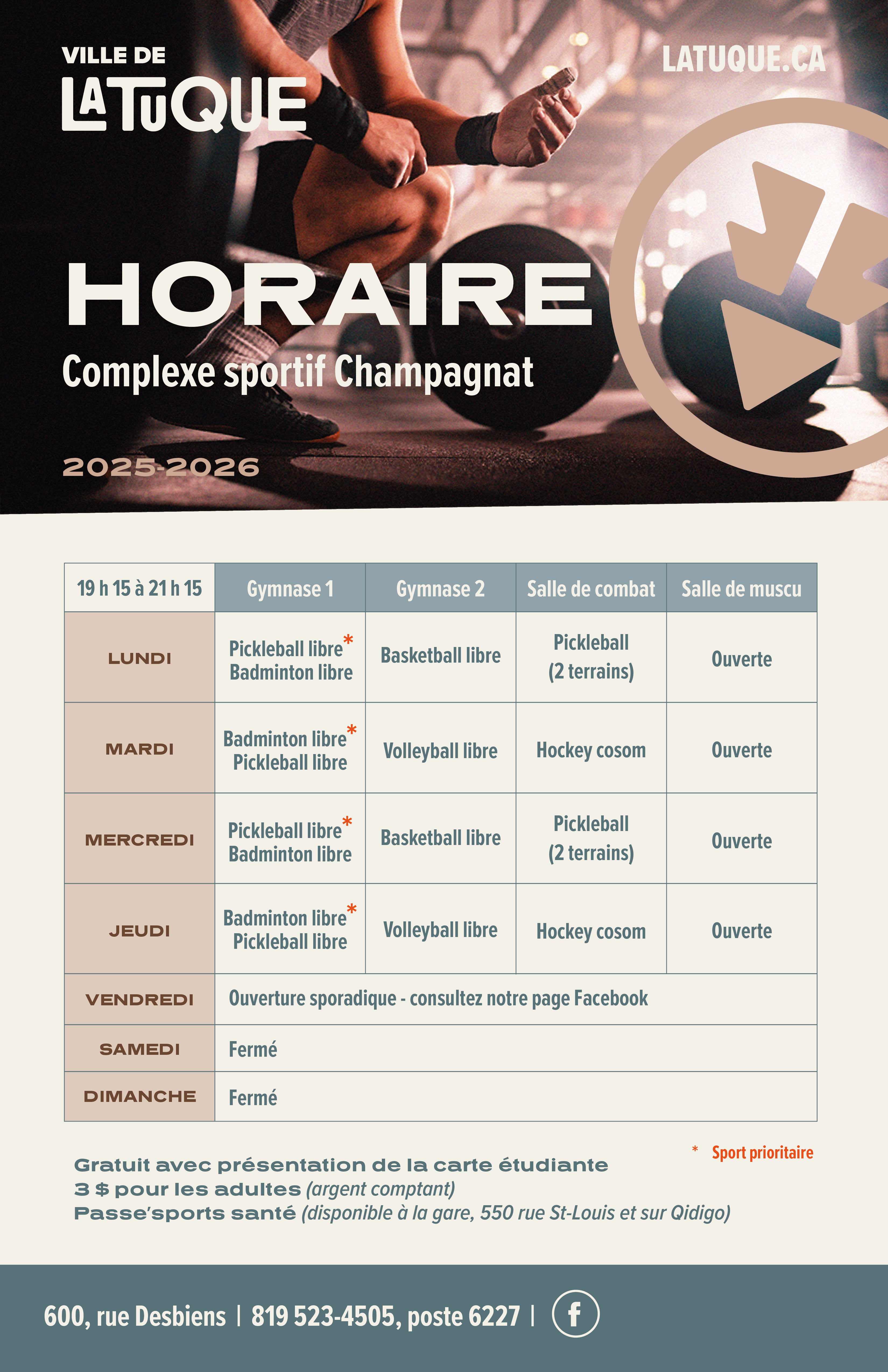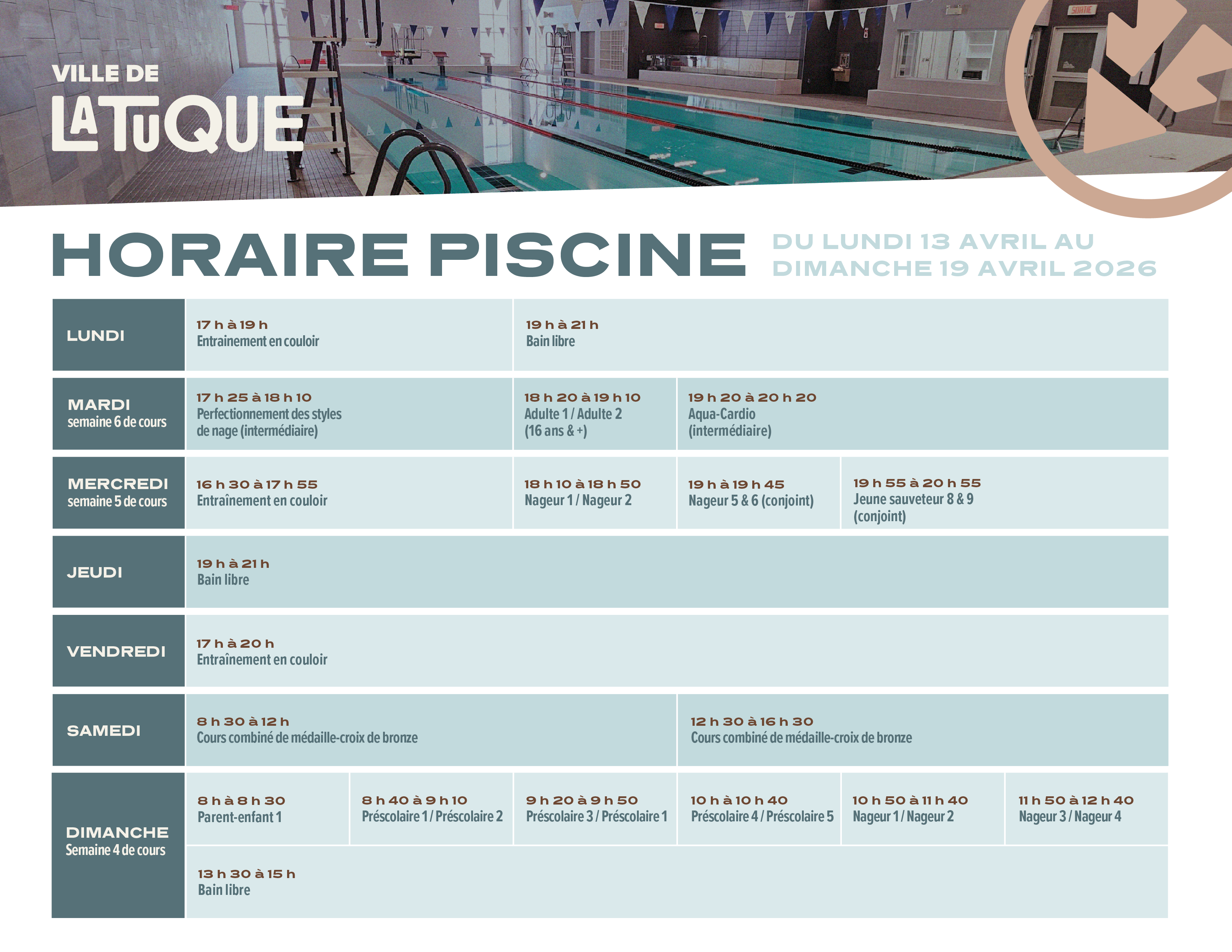 La salle de musculation est ouverte le samedi seulement lorsqu'il y a des cours de natation.