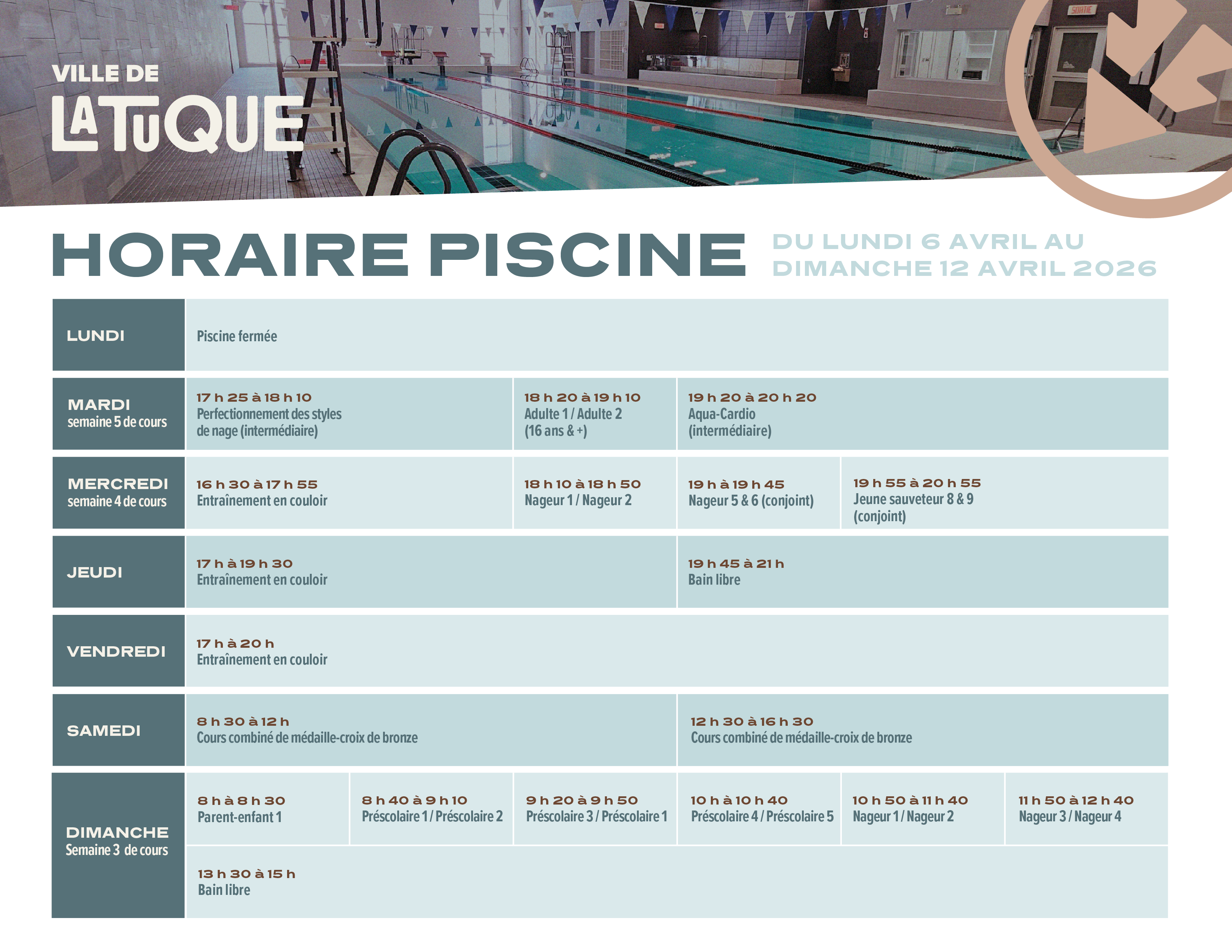 Nous sommes toujours à la recherche de sauveteur national et d'assistant sauveteur. Si vous avez le goût de surveiller nos installations vous pouvez envoyer votre CV à notre équipe des ressources humaines rh@ville.latuque.qc.ca.