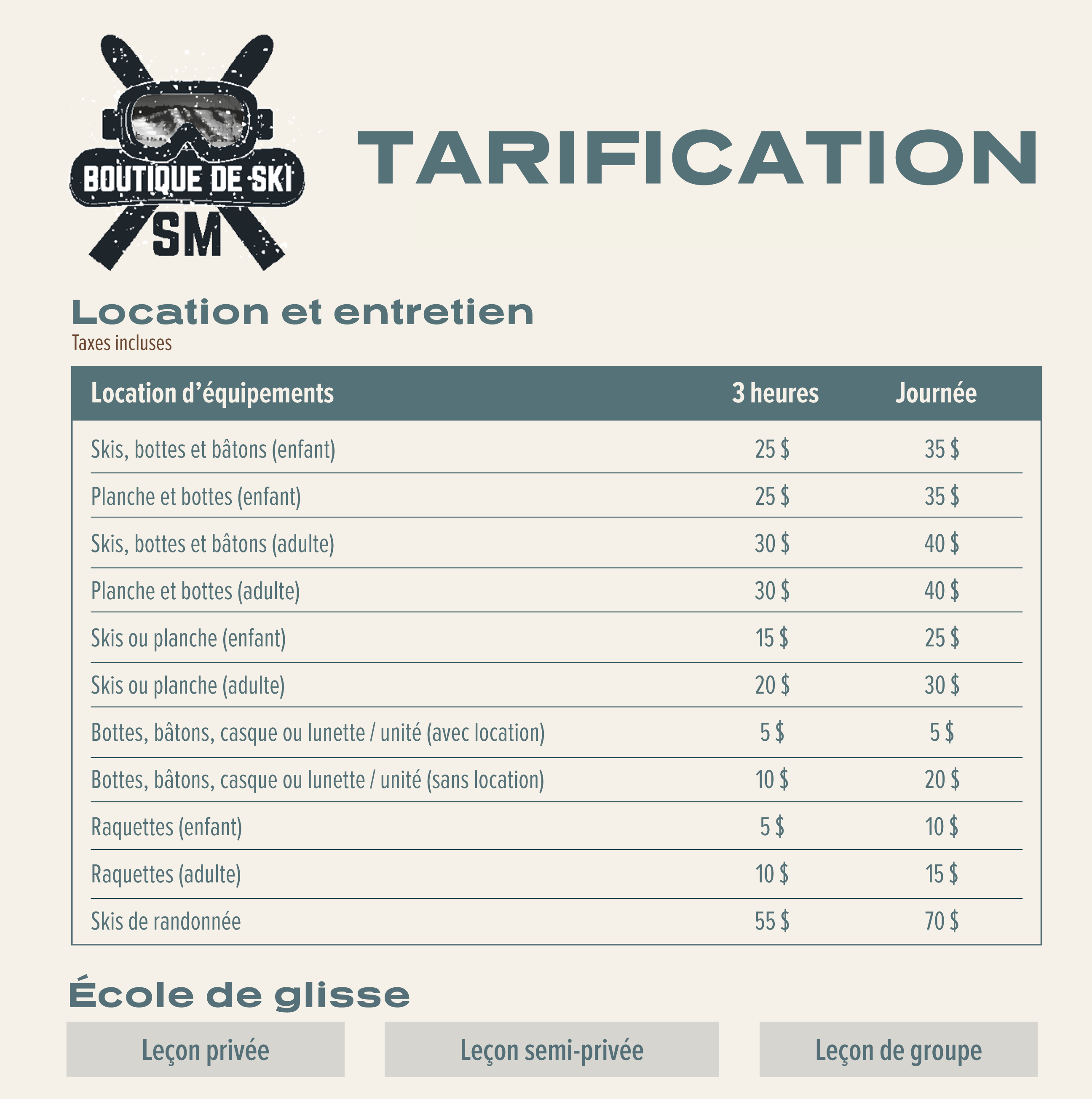 Tous nos équipements qui sont en location sont récents. Vous y trouverez skis, bottes, bâtons, planche à neige, casque, etc. La boutique est située au sous-sol du chalet de Ski La Tuque. On y accède aussi directement de l'extérieur par un escalier qui mène à cet étage où sont situés aussi les casiers.