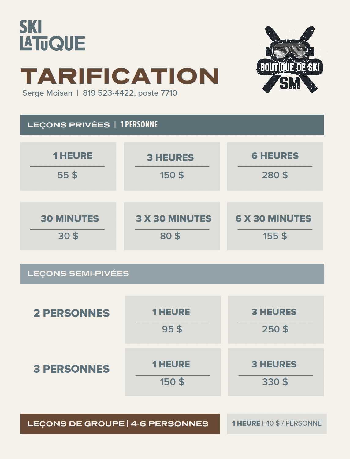 Ski La Tuque offre la possibilité aux nouveaux skieurs de tous les âges d'apprendre à skier ou de perfectionner leur technique grâce à son École de ski. Il est possible de s'inscrire à des cours en groupe ou de recevoir des leçons individuelles.