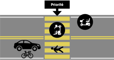 Lorsque le passage n'est pas situé à une intersection contrôlée par des feux de circulation ou des panneaux d'arrêt, la personne utilisant une AMM doit, avant de s'engager, s'assurer qu'elle peut le faire sans danger. Lorsqu'un piéton ou une personne utilisant une AMM s'engage dans un passage pour piétons, les autres usagers (véhicules routiers, bicyclettes et AMM) doivent s'immobiliser et lui permettre de traverser.
