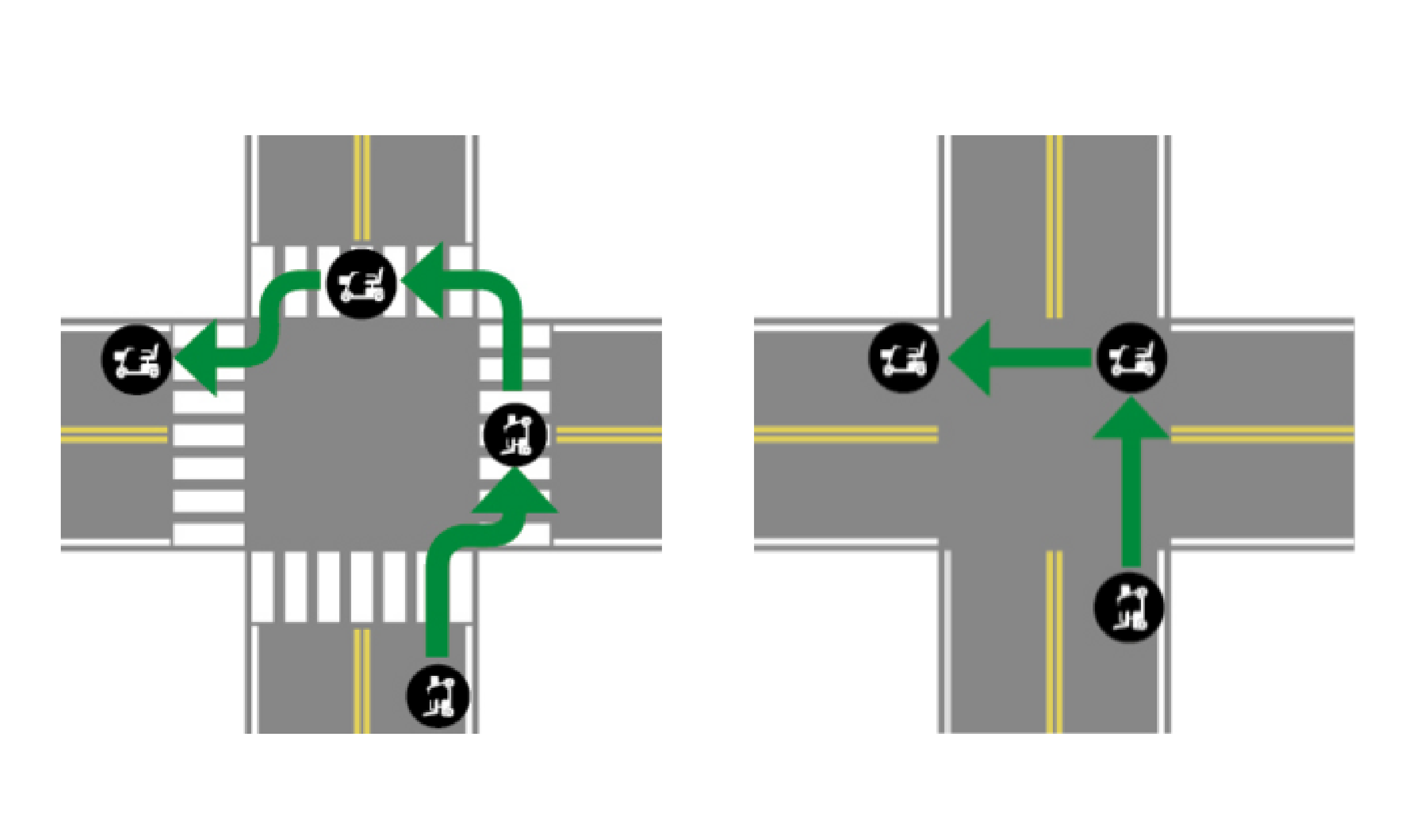 Lorsqu'il n'y a pas de feux pour piétons, vous devez traverser l'intersection en deux étapes, en restant toujours à droite de la chaussée, comme l'image ci-haut. |