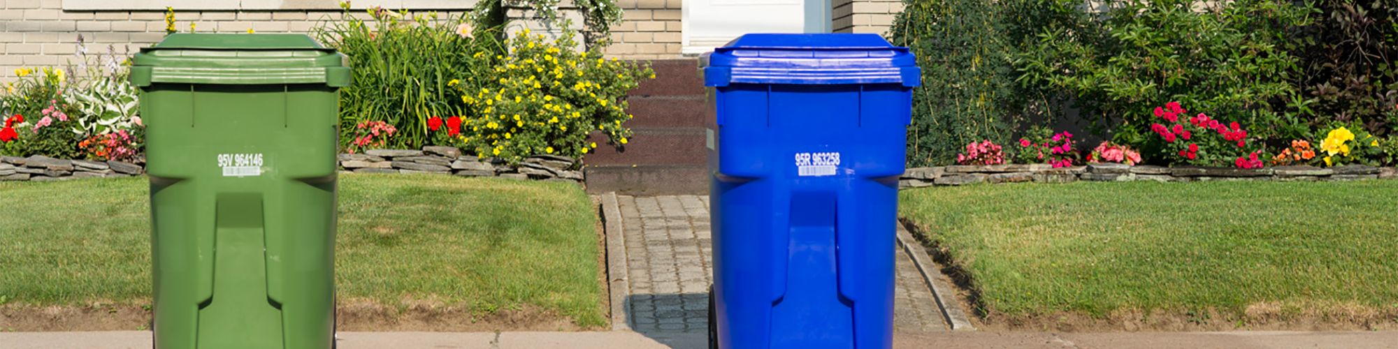 Lorsqu'il y a la collecte du bac vert et du bac bleu la même semaine, vous devez laisser une distance d'au moins 3 pieds (36 pouces ou presqu'un mètre) entre les deux bacs pour permettre au bras mécanisé du camion de pouvoir les soulever. Vous pouvez aussi les mettre de chaque côté de votre entrée, ce qui peut s'avérer une solution plus simple pour vous.