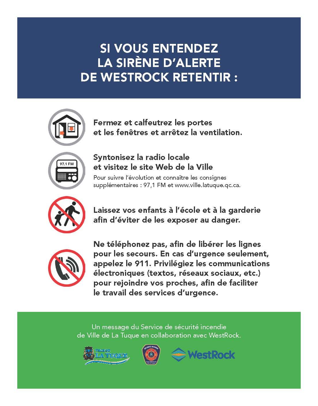 Depuis novembre 2019, l'usine WestRock de La Tuque est munie d'une sirène d'alerte à la population qui retentira si un jour il se produit un accident industriel majeur qui entraîne un danger pour les personnes qui habitent près de l'usine et celles qui y travaillent.