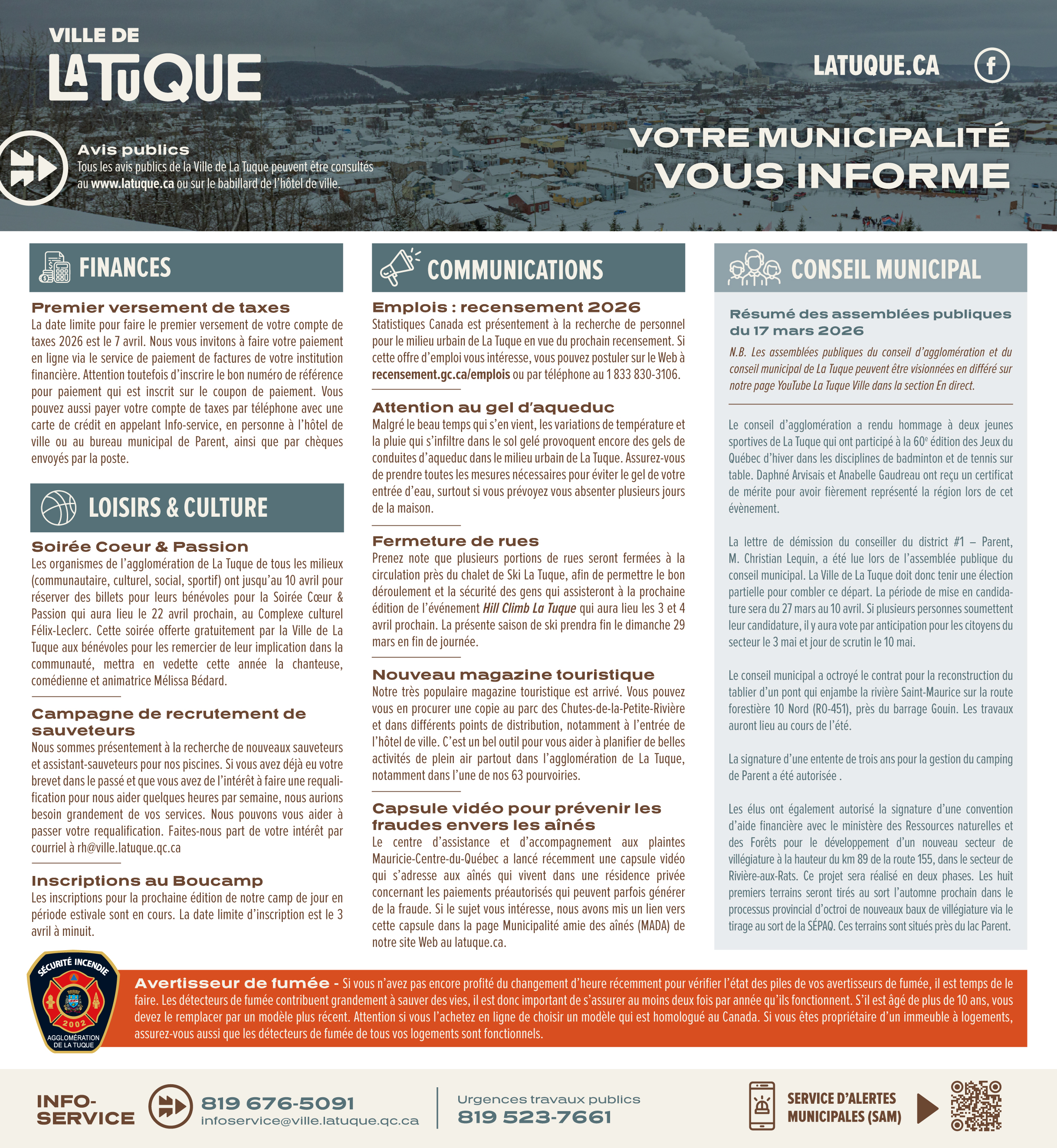 Vous pouvez consulter ci-dessous la version PDF des publicités Votre municipalité vous informe. Cette publicité du Service des communications est publiée à l'endos du journal hebdomadaire L'Écho de La Tuque une fois par mois, parfois deux fois par mois en cas de besoin.