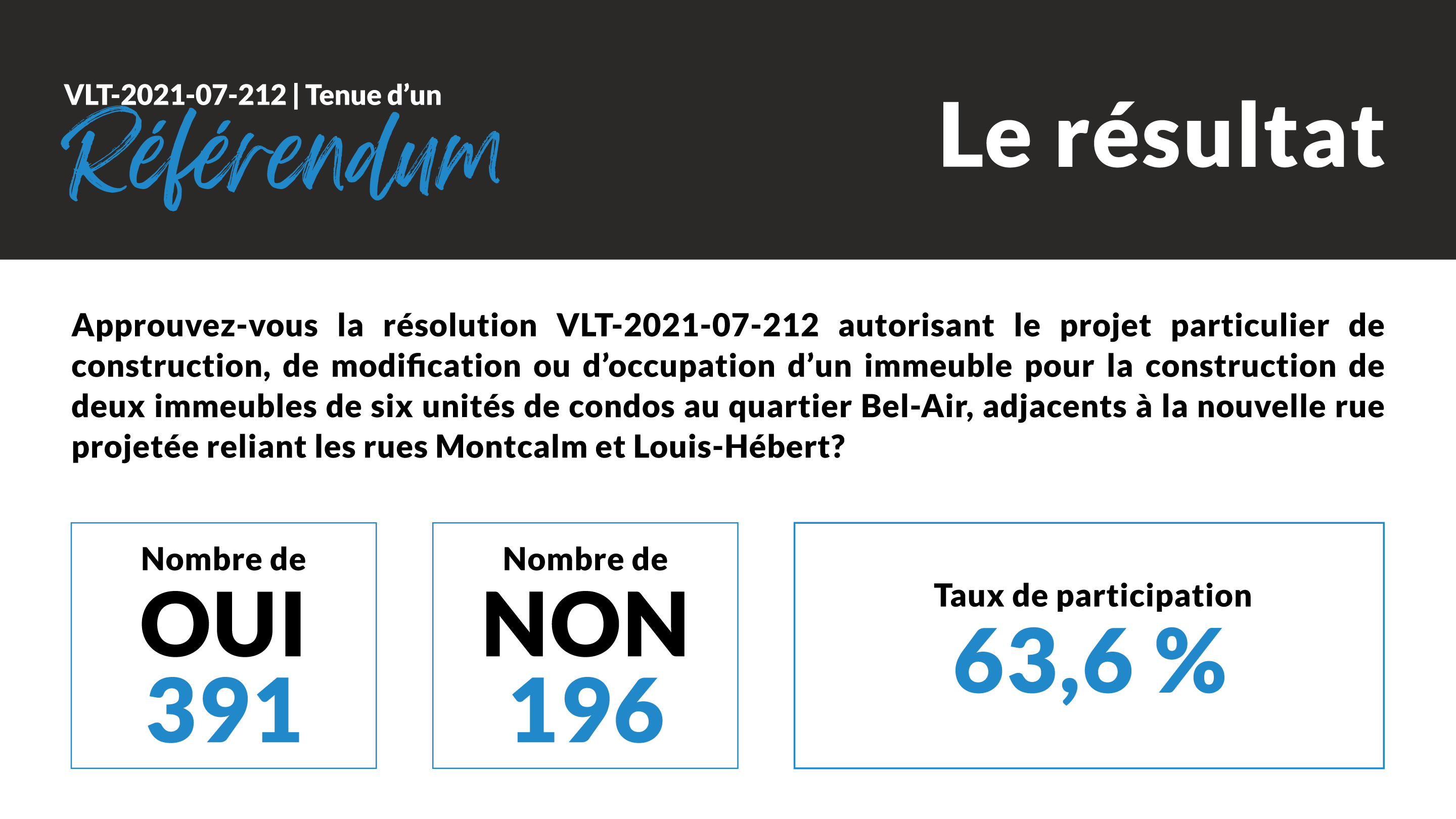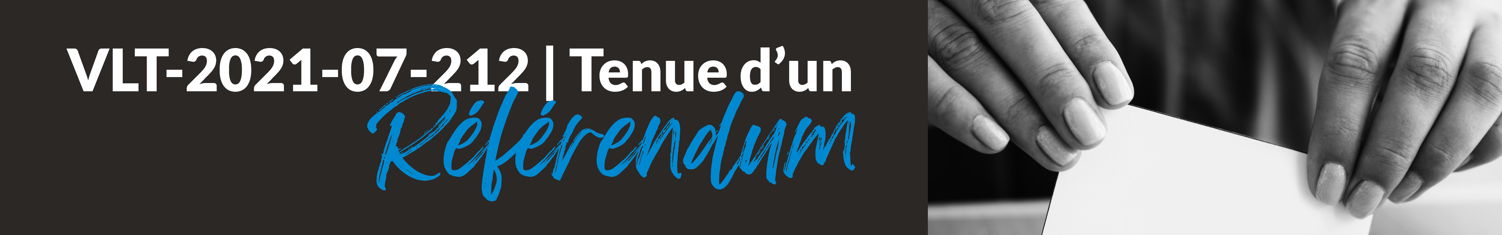 À la suite d'une décision du conseil de soumettre aux personnes habiles à voter (résidents, propriétaires d'immeubles ou occupants d'entreprise du secteur concerné) la résolution no VLT-2021-07-212, celui-ci fera l'objet d'un scrutin référendaire le 3 octobre 2021.